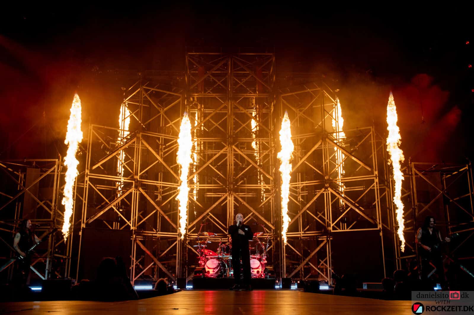 Scenen var bygget som et stort stilladsbyggeri, som senere skulle vise sig at indeholde et særdeles flot og iscenesat lys-og pyroshow hele aftenen igennem.